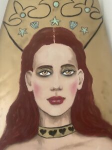 Bardot – 75in H x 18in W x 1in D – mixed media on surfboard. Collage, oil paint and found objects. lightly varnished. Back of surfboard is painted gold. – SOLD!! 🔴